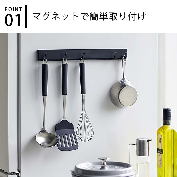 商品名 マグネット可動式キッチンツールフック タワー 商品詳細 サイズ 約 W35×D3.5×H4cm 重量 約150g 素材 本体:ABS樹脂 マグネット 滑り止め:シリコーン 耐荷重 フック1つあたり約250g 耐熱/耐冷温度 90℃/-40℃ 取り付け可能な壁面 マグネットの付く平らな面・スチール壁面 検索キーワード マグネット可動式キッチンツールフック タワー tower 収納 整理 お玉 フライ返し 5022 5023 キッチン収納 吊り下げ 掛ける ミトン 傷つけない 穴あけ不要 冷蔵庫 キッチン小物 調理小物 ホワイト ブラック 磁石 ハンガー シンプル おしゃれ 山崎実業 yamazakiマグネット可動式キッチンツールフック タワー 壁面を使ってスッキリ収納サッと手に取れて便利マグネット式5連ツールフック 冷蔵庫横やキッチンパネルにマグネットで簡単に取り付けできるキッチンツールフックです。