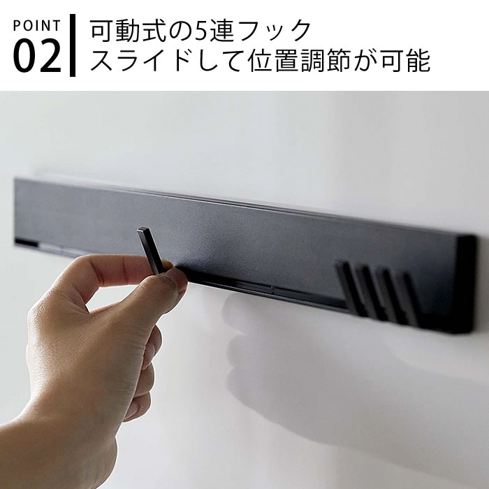 スライド式のフックは、掛けるもののサイズに合わせて位置を調整できるので、ツールを重ねずに収納できます。